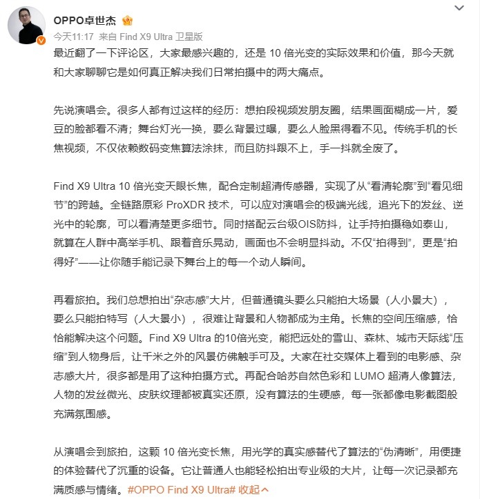4月7日,OPPO Find系列产品负责人卓世杰通过微博揭秘Find X9 Ultra的10倍光变天眼长焦核心体验,凭借硬核光学实力,这款新机精准攻克手机拍摄两大场景痛点,成为名副其实的演唱会拍摄神器与旅拍大片利器十大股票配资公司,让普通人无需专业设备也能拍出质感影像。